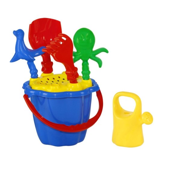 Zestaw zawiera wiaderko, łopatkę, foremki, grabki, konewkę i sitko.