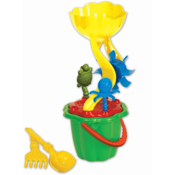 - bardzo bogaty zestaw do piasku składający się z 6 elementów: młynka do piasku, średniego wiaderka, 2 foremek w kształcie zwierzątek morskich oraz średnich grabek i łopatki