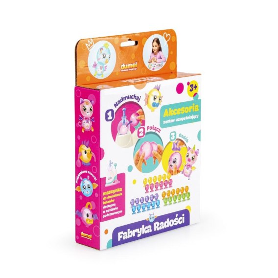 Daj wyraz własnej kreatywności, tworząc balonowe stworki! Zestaw akcesoriów to uzupełnienie do zestawu podstawowego, Fabryka Radości - Balony. Znajdziesz w nim aż 162 elementy, a wśród nich kolorowe balony, naklejki i wesołe oczka, z którymi stworzysz jeszcze więcej balonowych postaci.