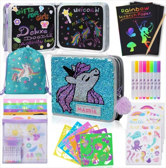 Zestaw aktywności „Jednorożec" Amitie Lane, naklejki na torby prezentowe i książka do rysowania dla dzieci