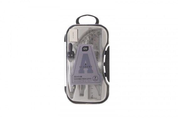 Zestaw geometryczny w poręcznym i wytrzymałym etui na zatrzask, umożliwiającym bezpieczne przechowywanie i przenoszenie. W zestawie 7 elementów: metalowy cyrkiel, gumka, rysik, linijka 15 cm, ekierka ostrokątna, ekierka prostokątna i kątomierz. Komplet przyrządów geometrycznych stanowi niezbędne wyposażenie plecaka każdego ucznia. Dostępny w 3 opcjach kolorystycznych: pastelowym różu, pastelowej zieleni i czarnym.