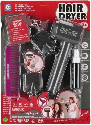 Zalety produktu: rozwija kreatywność dziecka, pozwoli dziecku wczuć się w rolę prawdziwego fryzjera. Zestaw fryzjerski do tworzenia stylizacji fryzjerskich. Zawartość zestawu: suszarka do włosów + 2 nakładki, 1x grzebień, 1x buteleczka-spray do włosów, Zestaw wykonany z plastiku i kartonu. Suszarka wydaje dźwięk prawdziwej suszarki podczas suszenia włosów. Wymiary/waga/baterie: wymiary opakowania (dł. x wys. gł.) [cm]:27x37x5, wymiary produktu (dł. x wys. x gł.) {cm} -suszarka 6x23x8, waga produktu bez opakowania [kg]: 0,18 kg, waga produktu w opakowaniu [kg]: 0,27 kg, Wymaga zasilania bateriami -suszarka do włosów 2x AALR06- nie załączone do zestawu. Zestaw przeznaczony dla dzieci w wieku: 3+. Pakowany na bistrze. W kartonie po 30/60 szt.