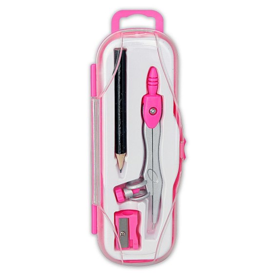 Metalowy cyrkiel z drewnianym ołówkiem. W komplecie temperówka. Całość w kolorowym etui z zawieszką.