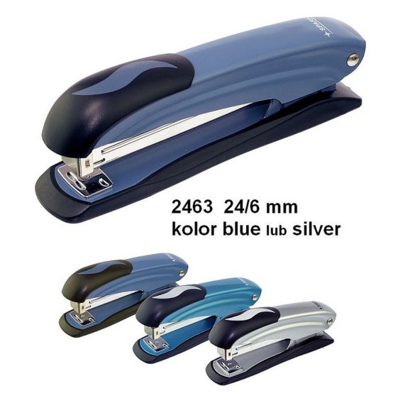 Duży metalowy zszywacz 2463 z przeciwpoślizgową nakładką z miękkiego tworzywa, zszywki 24/6 lub 26/6, zszywa do 20 kartek papieru jednocześnie, zasięg zszywania do 90mm, kolory: niebieski i srebrny, seria SparkLine