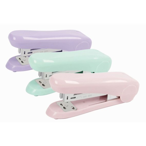 Zszywacz w 3 pastelowych kolorach. Miła w dotyku obudowa soft touch. Wyposażony w dwie opcje zszywania. Rozmiar zszywek: 24/6 lub 26/6. Zszywa do 20 kartek.
